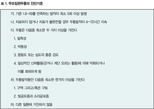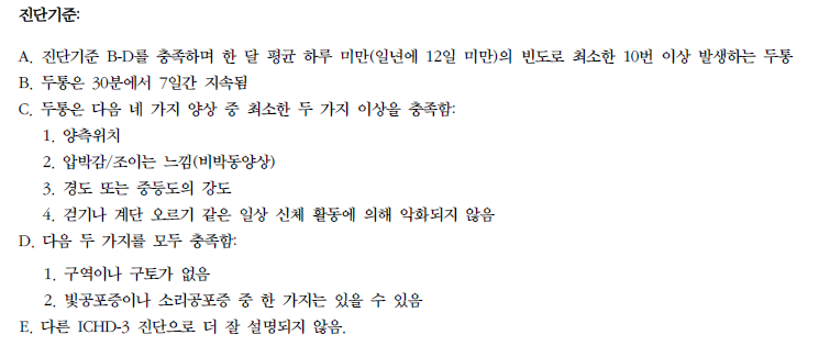 -일차성 두통 : 특별한 원인 없이 발생, MRI 상 정상소견, 증상을 토대로 감별