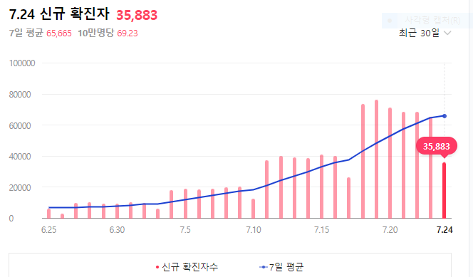 7월 25일 0시 기준 코로나19 신규 확진자 수는 3만 5천여명 으로