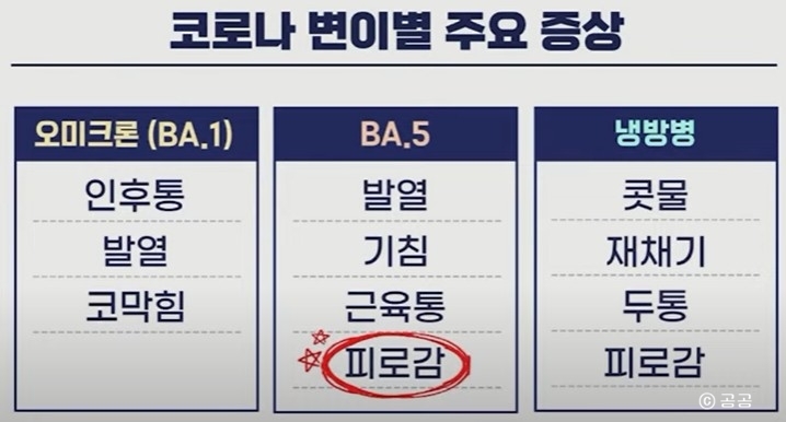 기침, 콧물, 두통, 피로감 등은 오미크론과 유사합니다.