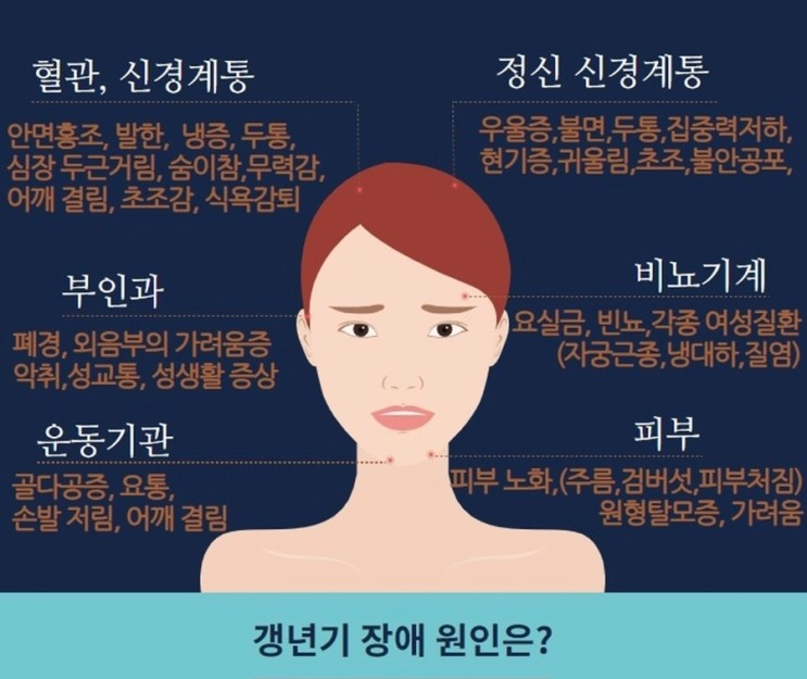 안녕하세요 궁금하닥입니다. 오늘 포스팅에서는 폐경기 전후에 나타나는 안면홍조, 근육통, 불안, 불면 및 피부건조감, 질위축 등 여러 증상을 아우르는 갱년기 장애에 대해 알아보도록 하겠습