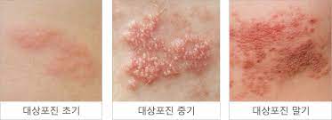 띠 모양의 가늘고, 줄을 이룬 모양의 발진이 발생하며,발진은 점차 팥알크기의 수포(물집)로 바뀝니다.
