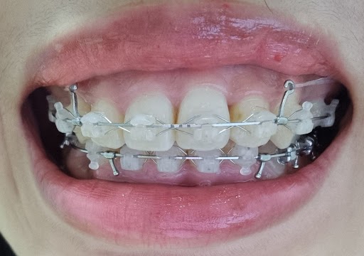 왼쪽, 철사를 연결한 뒤 고무줄을 이은 모습 오른쪽, 일반적인 배열 전체적인 치아 배열은 저번달에