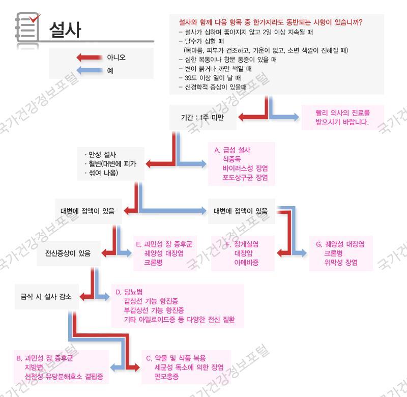 출처: 국가건강정보포털 발생양상과 증상정도를 토대로 설사의 원인을 추적합니다.