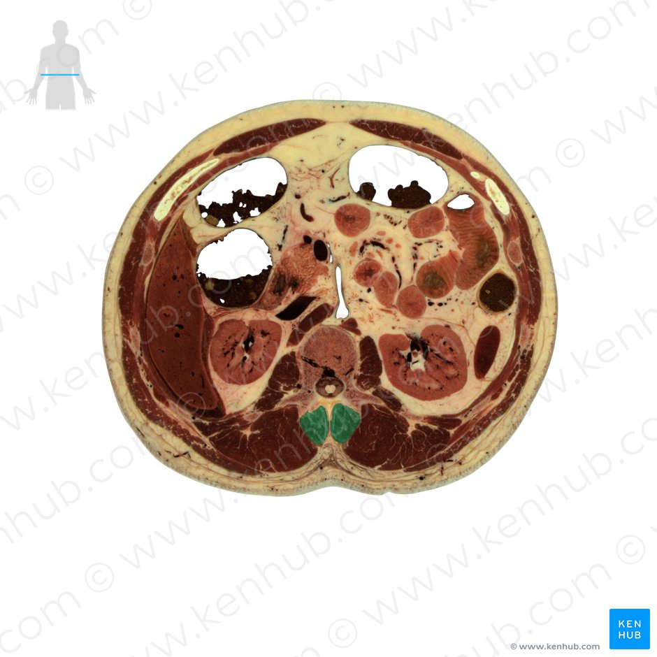 Multifidus lumborum: Mammillary processes of lumbar vertebrae, posterior aspect of sacrum, posterior superior iliac spine (PSIS) of ilium and posterior sacroiliac ligament)insertion : 기시부보다 2-4 상방의 극돌기