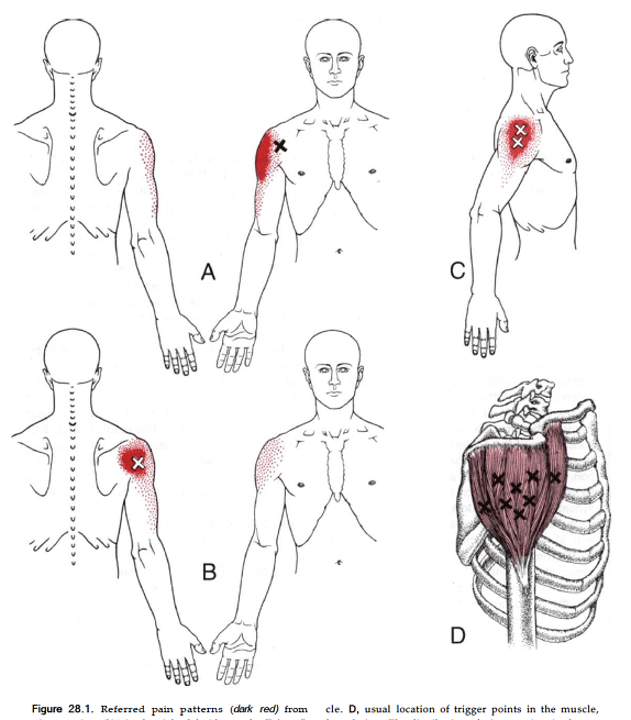 삼각근은 전부, 중부, 후부 섬유의 근막 자체에 통증을 방사하며,