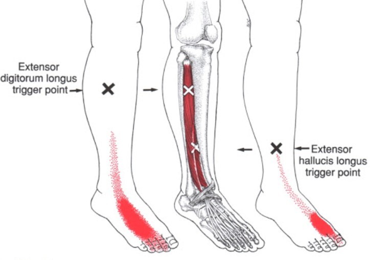 전경골근은 엄지발가락 자체에 통증이 생기지만