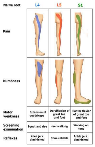 * 하지방사통 : 수핵 탈출에 의한 신경근의 압박으로 발생. 신경 분절에 따라 나타남