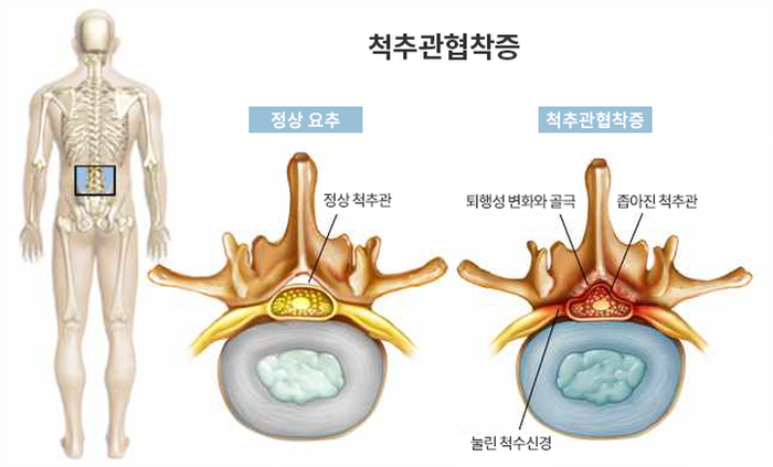 척추관 협착증은 척추관, 신경근관 또는 추간공이 좁아져서