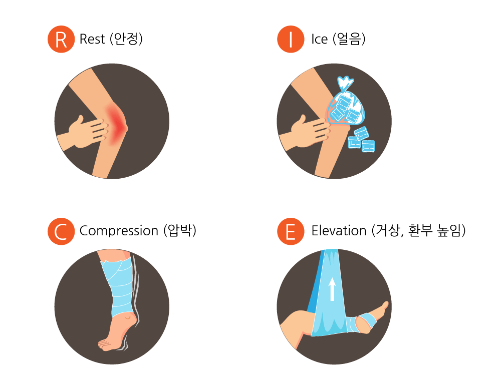 종아리근육파열의 초기 치료는 근육, 인대의 급성 손상 시 대처법과 동일합니다.