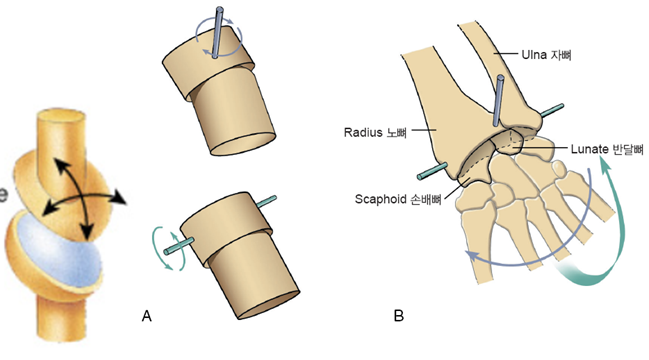 - 중쇠관절에서의 움직이는 관절면은 돌림축과 평행한 방향을 향함