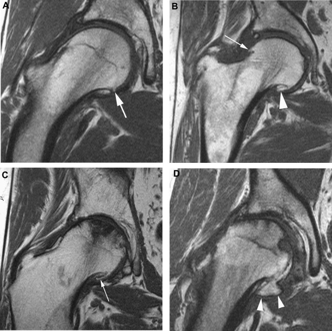 grade 3: criteria of grade 1 and 2 plus indistinct zone between femoral head and acetabulum; subchondral signal loss due to bone sclerosis