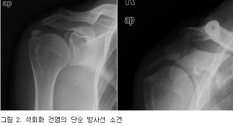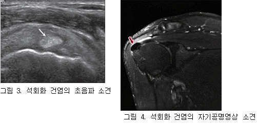 출처: 대한류마티스학회 석회화 건염은 앞에서 설명한 특징적인 급성 통증 증상 및