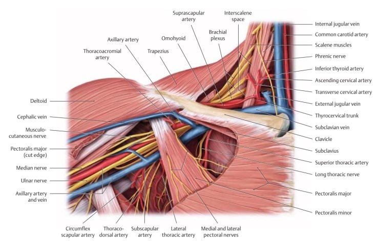 신경 (상완 신경총)과 혈관 (쇄골하 정맥, 쇄골하 동맥)이